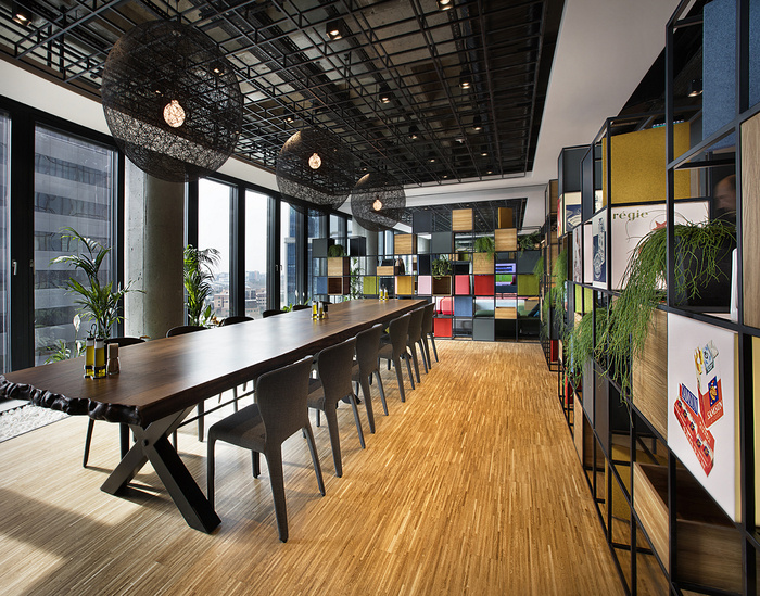 同时,项目的重点设计了不同的概念,包括小厨房和功能齐全、色彩丰富的自助餐厅。Cafeteira被规划为一个舒适宽敞的地方,以便全天使用,并包括会议和娱乐空间等多功能区域。不同于单调的开放式办公系统;代替了统一的固定工作安排,采用了差异化的工作安排,还在工作大厅内附加了弹出式会议单元和茶歇场所。#办公室装修方案#