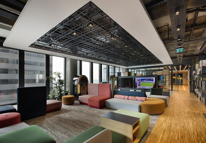 考虑到入口和接待处的紧密性,两层总面积为 4,500 平方米,由位于楼层之间的中庭上的功能性现代楼梯连接。为年轻而充满活力的企业团队设计了基于运动的工作系统??悸堑礁鞑棵胖涞幕ザ?,附加了流通系统。这个流通系统已经被工作单位、社交区域、会议厅统一和方便地激活。社会领域和工作领域之间的互动一直基于它们之间的共生关系。#办公室装修#