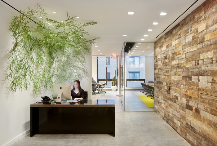 设计师制作的接待区独特的“植物状”绿色装置;混凝土既可以抵消温暖的木材,又可以用作地板上彩绘标牌的画布。质朴的木质细节与工业抛光混凝土地板、最先进的技术和豪华的家具形成鲜明对比,营造出独特、精致的空间,同时又舒适放松。#办公室设计公司#