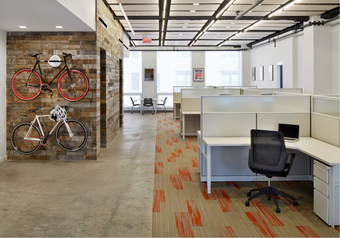 整个办公室设计装修使用的布局和材料至关重要:开放式平面图、玻璃办公室正面和每层楼的公共会议空间促进了员工之间的协作。管理合伙人办公室是一面滑动的玻璃墙,允许开放,鼓励员工自由进出。