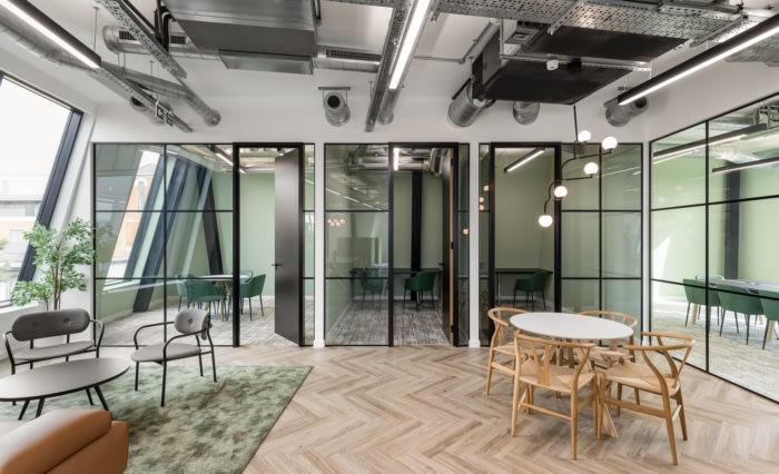 环绕墙壁的醒目图形为空间注入了色彩,旨在给观看该空间的潜在租户留下难忘的第一印象。为了加强设计的视觉冲击力,在定制厨房和休息区安装了特色照明、地铁风格的瓷砖和色彩缤纷的家具。自然色调和材料增添了现代清新的美感,这将吸引许多寻求“即插即用”工作空间的企业,他们可以在搬入后对其进行定制。#企业办公空间设计#