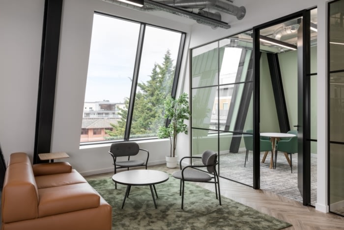 设计师围绕混合型员工的需求塑造了设计,以吸引大多数租户。这个混合工作场所融合了专注、协作和社交空间,可选择协作桌、正式会议室、触地长凳和轻松的公共区域,为随时随地的社交互动和会议创造机会。#办公空间设计#