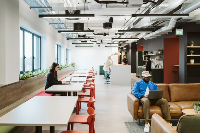 建在对面墙上的双会议室空间宽敞,带有轻松的开心果绿色,与大胆的现代赤土陶器形成鲜明对比。隐藏在墙壁内的是更多的电话亭和吊舱,这些都是为了满足日益增长的虚拟会议需求。#办公室空间设计案例#
