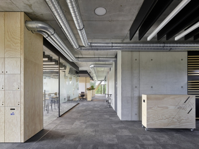 通过主入口进入大楼,房间以大空域的形式打开。天花板上的大型灯光装置和绿色墙壁吸引了人们的视线。在这个空域也可以找到巨大的主要通道。外露混凝土、钢和哑光黑色橡木地板的单层楼梯将地板相互结合。单层楼梯结束于不同的深廊,接收通信和居住区。#办公楼装修设计#