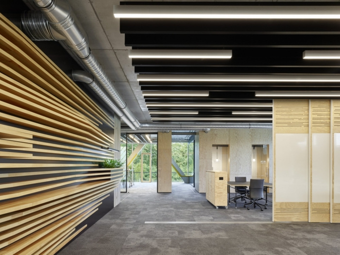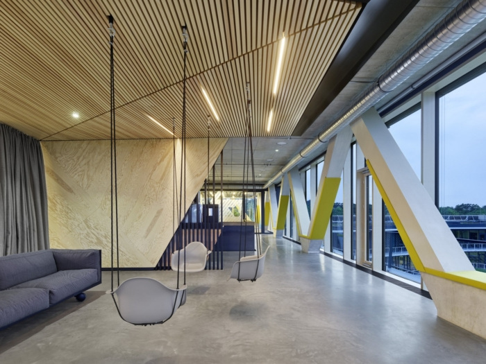 在一楼,咖啡吧、工作室、大型设计思维区和会议室围绕核心布置。在这些空间中,灵活敏捷的工作环境的理念最为明显。大型白板表面悬挂在天花板上,可以移动。在较高楼层,办公空间围绕核心呈 U 形,并由中庭的大玻璃隔开。工作站的设计与底层空间一样灵活。在这里,灵活的工作组也可以通过可移动的白板和可滚动的表格来组装。#办公楼装修设计方案#