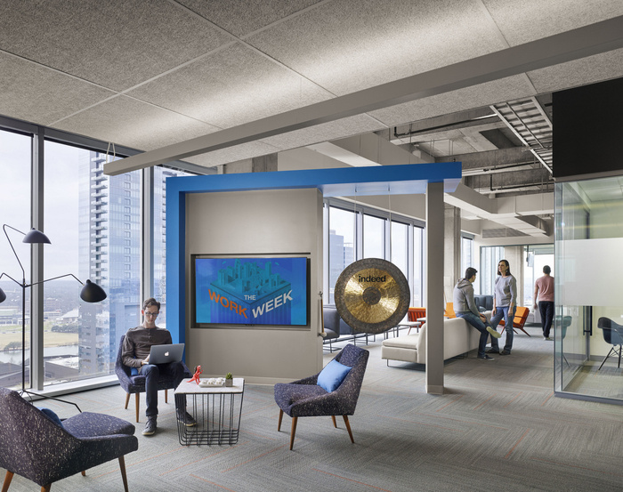 该空间提供了一个大型餐厅、游戏区、开放式办公室布局和各种协作空间,以扩展定义企业位于奥斯汀山区的总部的文化,设计师也帮助创建了一个空间。渐变的平台座位营造出公共氛围,而锣允许员工庆祝实现销售目标,因为他们选择的“主题曲”通过头顶扬声器播放。#广州办公室装修公司#