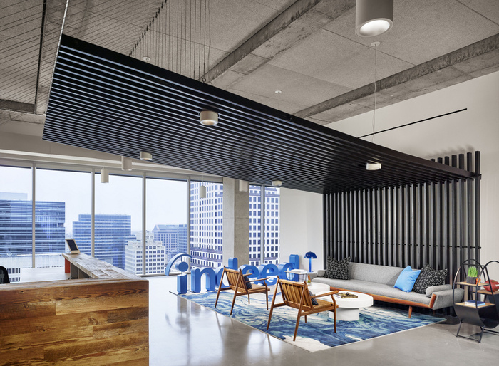 以运动为主题的空间融合了工业设计和精致的风格,以激励员工并提高士气。会议室和电话室是根据大学运动队和与每所学校相关的特色元素设计的。最大的会议室采用男性化装束,使用定制皮革装饰作为抽屉拉手,使用各种传统西装面料作为室内装潢,在整个办公室的协作区域也有类似的元素。#现代办公室装修方案#