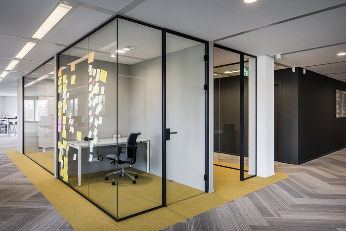 对于他们的员工来说,他们想要一个开放和透明的内部空间,他们可以在其中轻松地切换到另一个工作区/工作站。精致的细节是木地板,铺成“人字形”图案,无缝地变成具有相同图案的地毯。#办公室装修公司#