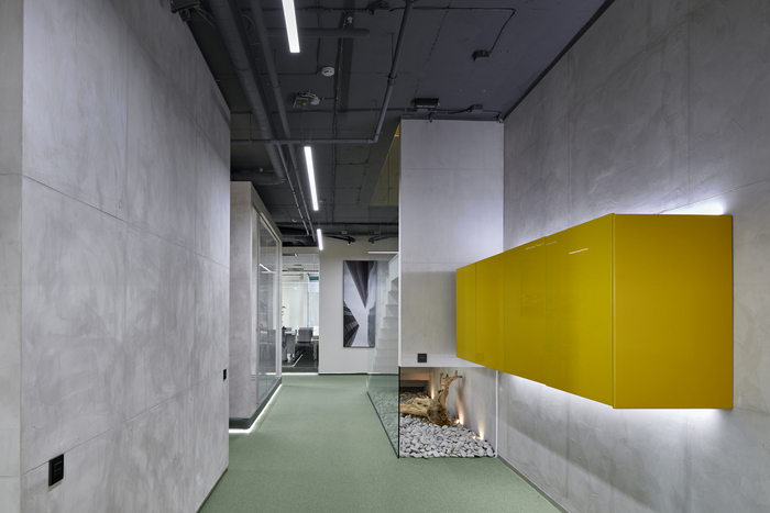 办公楼形象是由极简纹理和混凝土、金属、玻璃等粗犷的建筑材料的富有表现力的组合形成的。办公室的墙壁是混凝土浇筑的,带有框架标记;金属网格隐藏了天花板工程系统,并通过消散灯光营造出特殊效果。涂漆的家具元素包含咖啡点、衣柜和储藏室。全球建筑的大型照片强调了领先建筑公司的形象。#办公楼装修方案#
