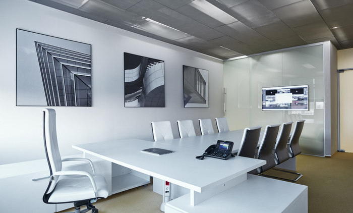 办公楼空间布局是作为对简报的合理回答而创建的。会议室由玻璃和混凝土制成,在一楼开放空间的低平台上稍微抬高了一点。最大的一个是大型项目团队的主会议室。工作站主要位于建筑物周边,采光充足?;嵋槭业耐该魈辶看丛炝税旃占浣峁?,并保持了能见度和良好的日照。#办公楼装修公司#