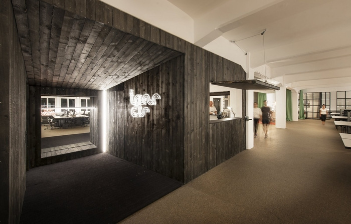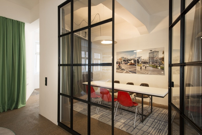 凭借其白色的混凝土框架,单层办公空间具有清晰的工业空气,这要归功于定义中轴的结构柱。房间的尽头是深色钢架玻璃会议室。每个后面都是办公室和会议室。这种对建筑物工业历史的参考反映在其巨大的窗户上,这些窗户允许自然光从外面流入,并提供外面庭院的广阔视野。#广州办公室装修设计#