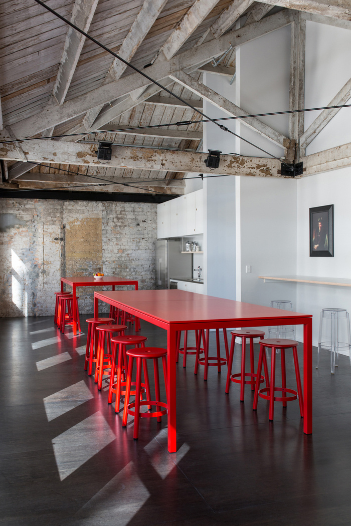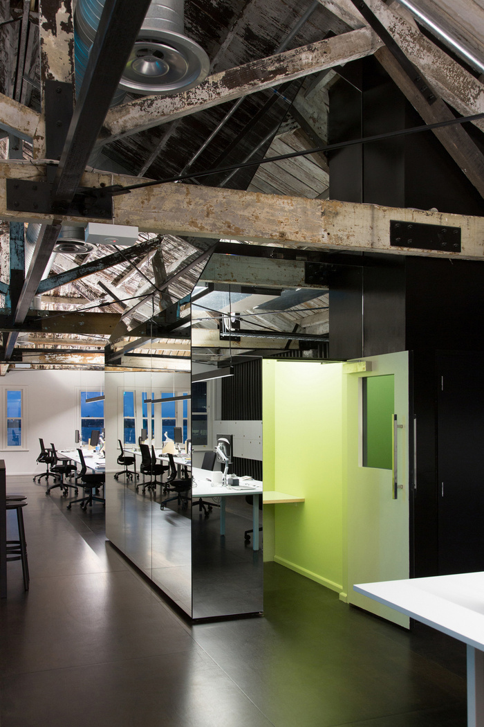 现有的木地板已损坏无法修复,无法打捞。没有用新的等价物复制这些,而是将其视为创造独特事物的机会,并引入了一个 1.2mx 2.4m 染色梅兰蒂胶合板??樽魑善繁砻?。面板的大小增强了空间的规模,并在整个楼层以重复的交错图案布置,创造了一个网格,给出了秩序,并建立了一个处理信息流的合理框架,即霓虹灯。镜面墙板与地板的模块尺寸相同,并与梅兰蒂胶合板地板精确对齐,进一步增强了秩序。#厂房办公楼设计装修#