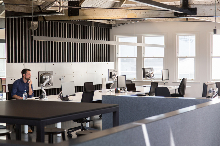 黑色隔音材料被引入开放式工作空间的后墙上,由垂直的生钢部分固定。简报要求为每位工作人员配备单独的储物柜,这被设想为垂直钢内的一条浮动数据集,在表格内设置的圆形图案也可兼作把手。这种圆形图案也适用于厨房橱柜。#公司办公楼设计装修#