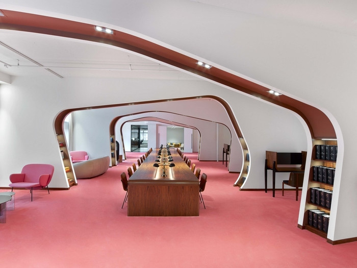 灵感来自 1970 年代模糊的意大利剧院,四周都是圆角和毛绒地毯,非常适合撤退阅读或发送几封电子邮件。当阳光透过窗户照进来时,整个空间都泛着粉红色。是温柔的代名词。#办公室装修方案#