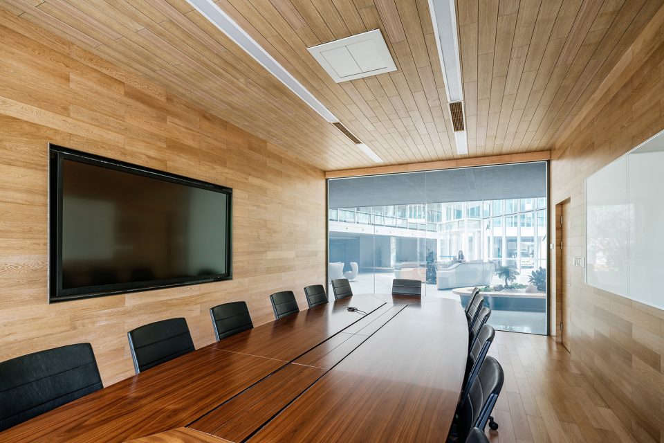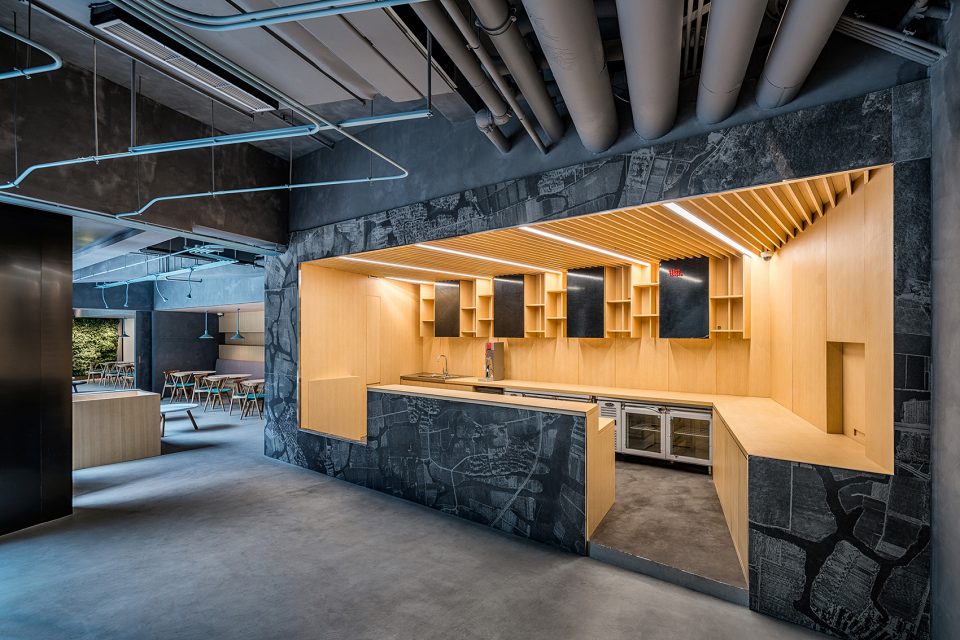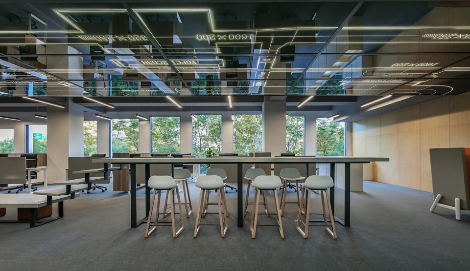 木楼梯是这栋楼的交通流线灵魂,它连接了所有的空间层,公共走道用现代感较强的深灰色作为主色调,会议室相对私密的走道用木质材质为主,形成了空间的包裹感受。核心办公区的楼层则更精彩,以建造和工业感为线索,在空间设计中以上海这座大都市城市天际线为设计元素,同时工业化的办公楼装修体现了建造行业龙头企业的特点,也反应出了这座城市的形象。