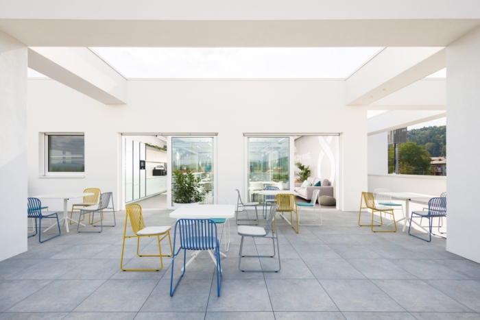 大楼的共享空间包括软座椅、豆袋、台面、圆形剧场和带自助餐厅座位的户外甲板。外窗和玻璃屋顶的中庭都充满了自然光。美学是干净的,适合个人的,充满了天然材料和柔和的色调。#办公楼设计方案#