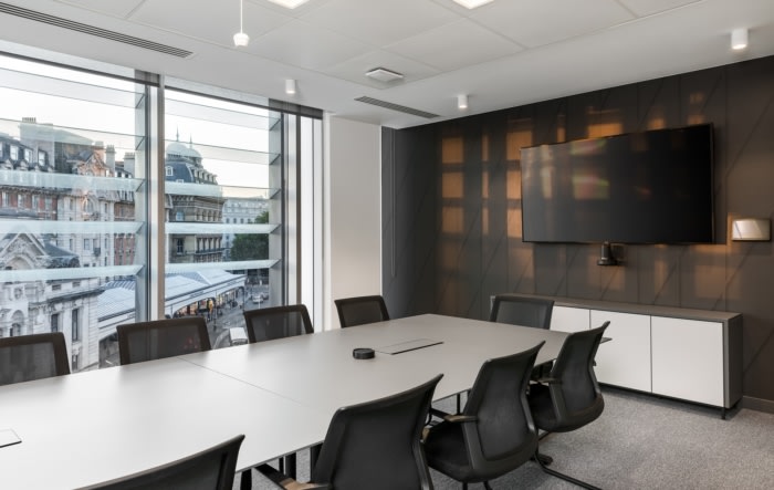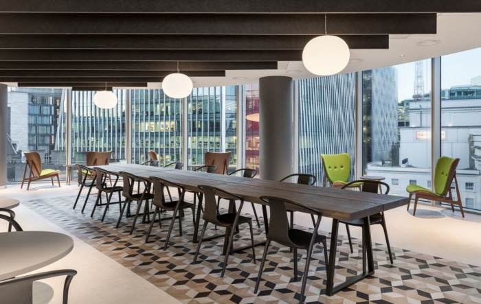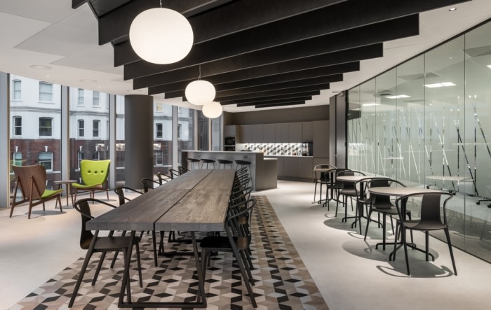 办公室装修:时尚的灰色调色板和企业的标志性绿色参考了它们与自然世界的联系