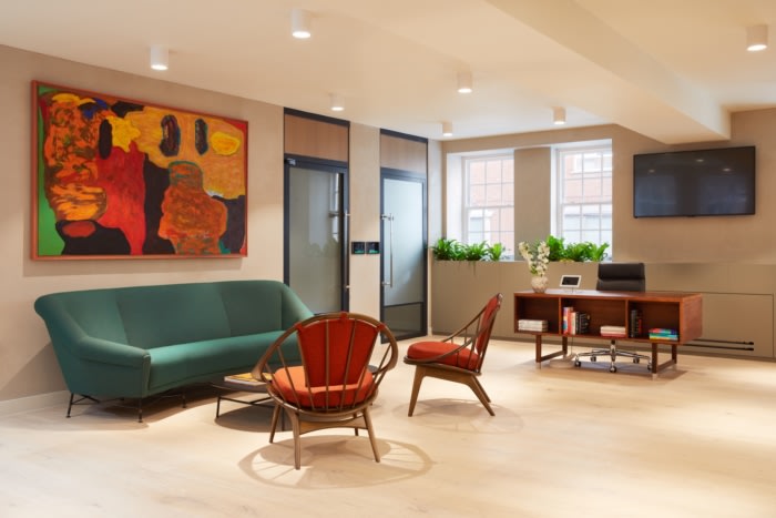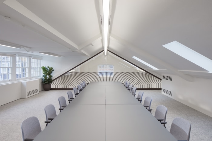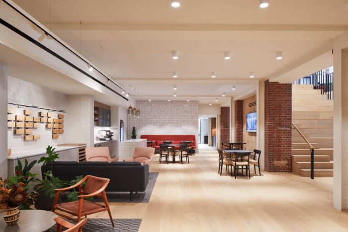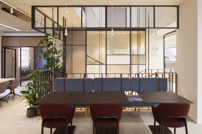 悬空楼梯的引入创造了一条开放的中央循环路线,将地面和一楼的共享空间与较高楼层的更多私人空间和会议室连接起来。新的平面图通过允许会议和活动、促进思想交流、推动创造力和协作来实现灵活性。#办公楼装修设计#
