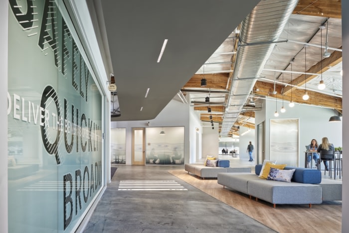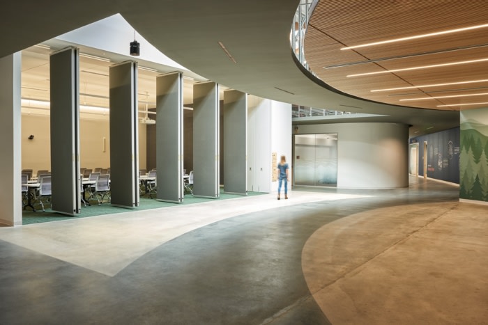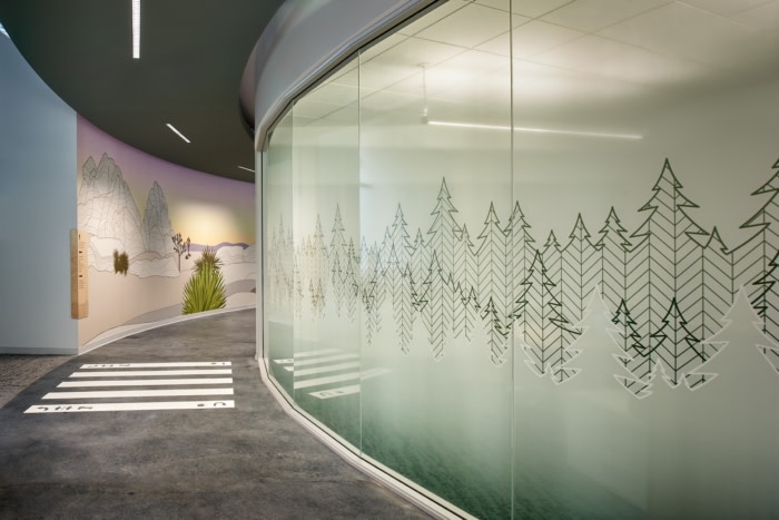 该建筑被划分为目的地区域,对应于驾车穿越金州时可以体验到的各种景观——湖泊、海滩、森林、沙漠和山脉。穿过社区的主要循环以开放道路为标志,在混凝土地板和上面的天花板上都呼应。与每个区域相关的有机图案在视觉上从一个区域流向另一个区域。醒目的标牌可以轻松导航到附近(带有方向图标的人行横道)或远处(受高速公路标志启发的寻路)目的地。#办公室装修#