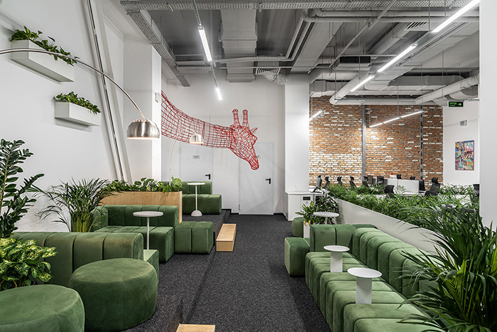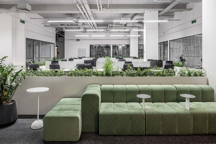基辅的缆索铁道是入口接待区的灵感来源。这一形象体现在接待区的装饰、饰面、造型和配色方案中。象征这座城市的图形符号——栗子叶——雕刻于等候区的沙发几上。配以大量柔软沙发且形式统一的休息区让人联想起基辅连绵的青山。#广州办公室设计公司#