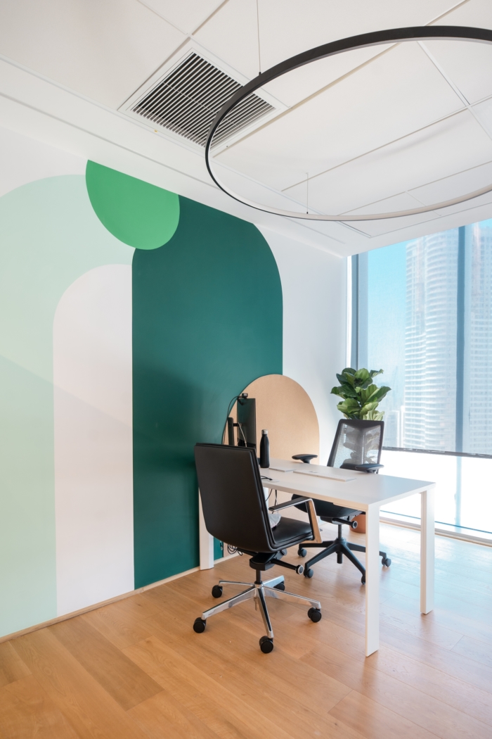 工作室选择了一种代表品牌的设计策略,并以抽象的方式将其核心价值转化为空间的不同区域。舒适温馨的家具搭配温暖深邃的色彩,营造出与绿色和自然植被相结合的家的感觉。所有这些都创造了一个舒适的工作空间和舒适的住宿环境。#办公室设计公司#
