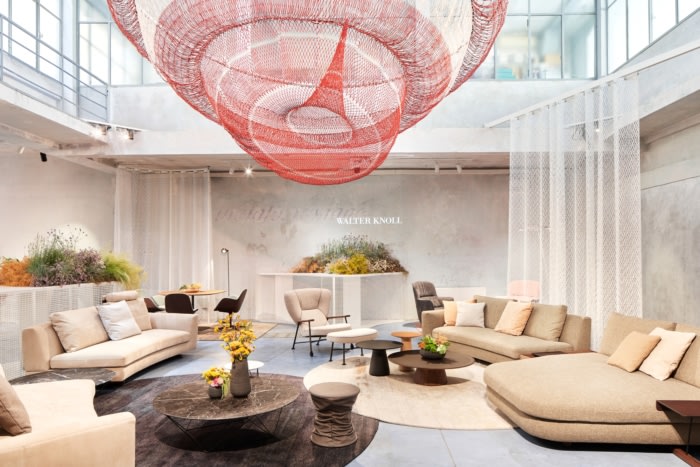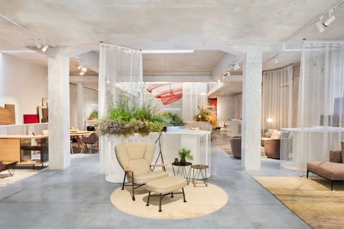 品牌标志和字样只是投射到墙上,因为它不是要添加新的油漆,而是关于分层结构的微妙诗意。凭借其强烈的物理性和触觉质量,家具与空间装置的花丝外壳和轻盈形成鲜明对比。材料表邀请参观者亲身体验一些织物、皮革和天然石材表面,从而在感官层面上与品牌互动。#广州办公室装修公司#