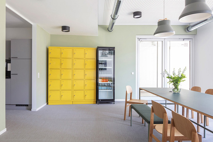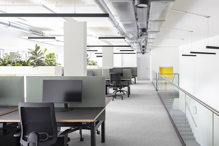 整体设计非常简约。设计以黄色为线索串联起整个空间,比如说家具上局部的黄色、装饰画、还有墙面黄色装饰等,构筑了一个统一的视觉整体,并与温暖的灰色和绿色形成鲜明的对比。#办公室装修案例#