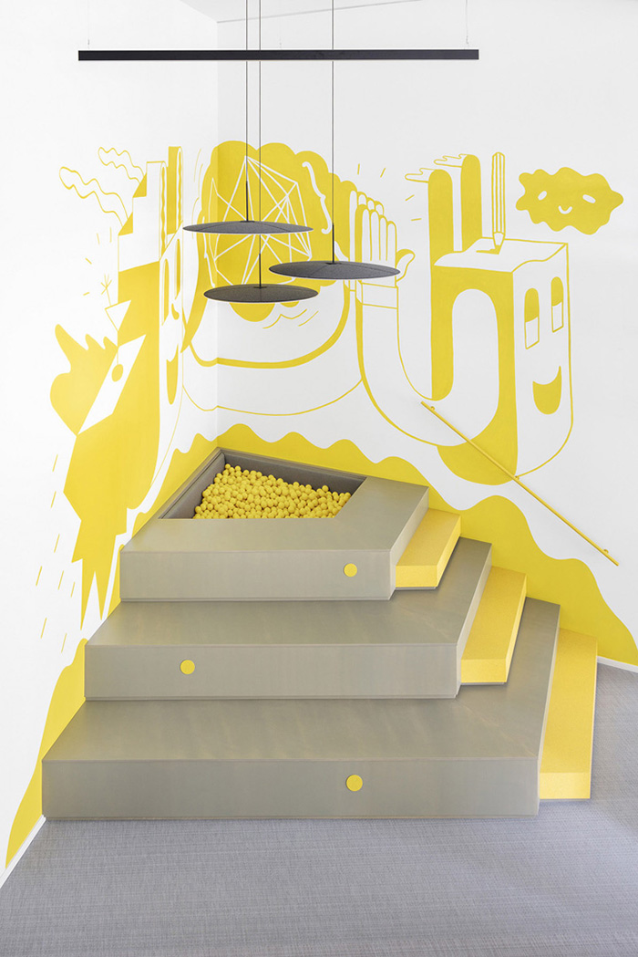 人们经过一处纯黄色的通道进入高大开敞的接待空间,6.5米高的天花板,这里还有一处有趣的阶梯座,顶面是个类似儿童乐园的球坑,上端放置了三盏声学灯具,界定出一方宁静的空间。#办公室装修公司#