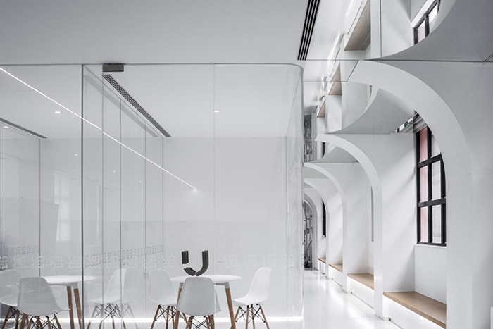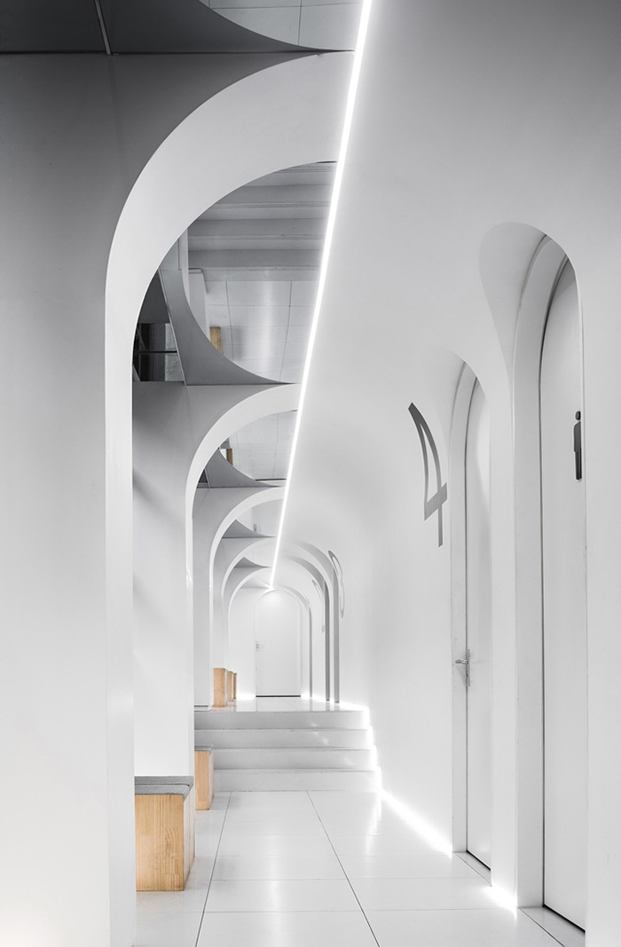 并结合原有建筑钢结构的基础上,使空间造型恰好可以让曲线延伸,形成拱形走廊,成为使用者们最常接触的场地和形成进入者与空间之间的关系。#办公室空间设计公司#
