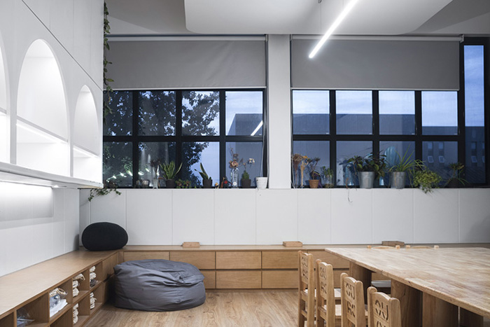 设计在整层空间中没有用到一处直射光源,二层所有的光都来自漫反射光源,并且这种光挑选了对儿童?;し段У难≡?。设计师创造了一款可适用于各种课程需要的道具模块,由四种不同长度的构件、连接件组成。利用协同作用的方式,根据实际需要可自由扩张和收缩。#办公室空间设计案例#