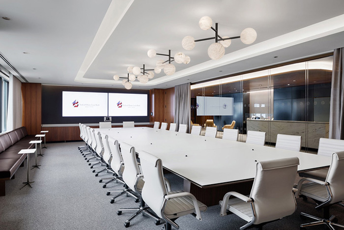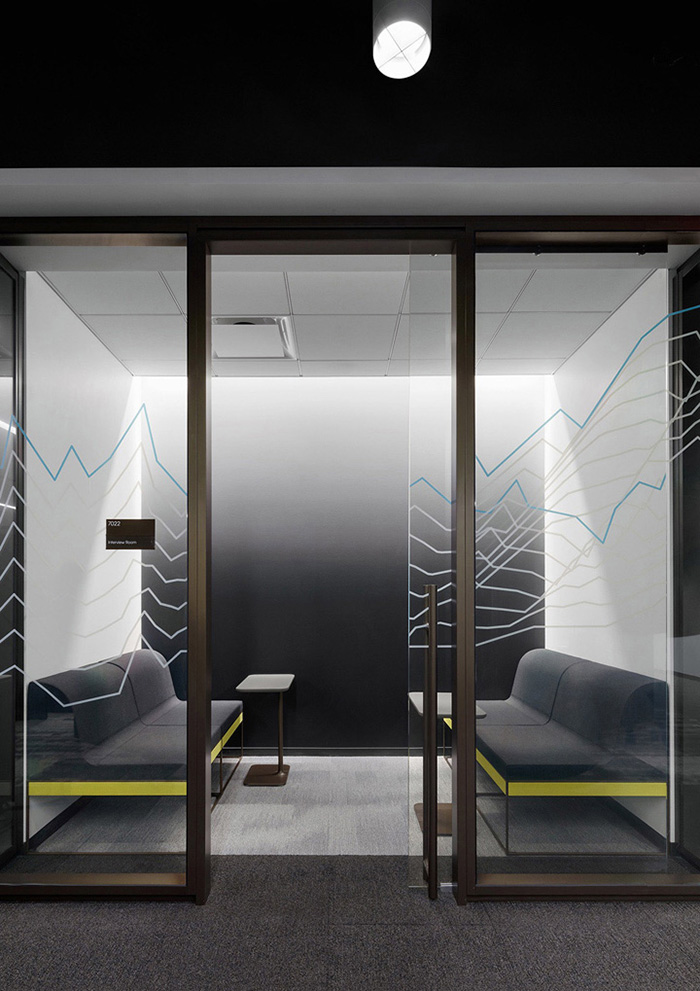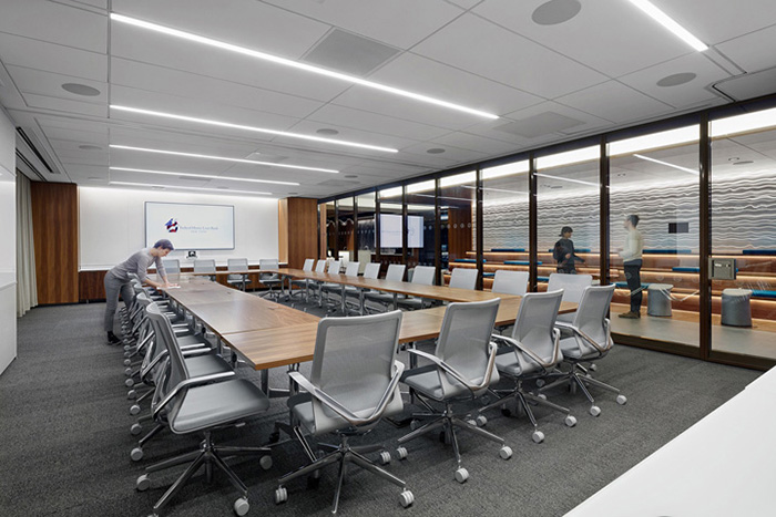 引人瞩目的装饰特点是来自波多黎各和维尔京群岛发现的生物荧光海湾,通过灯具装置的创建呈现于电梯大厅。应用于办公区的环境图形采用的是银行资助的四个社区项目的图像;其它图形显示了向会员银行提供贷款和融资的历史趋势以及银行的使命声明。#办公室设计案例#