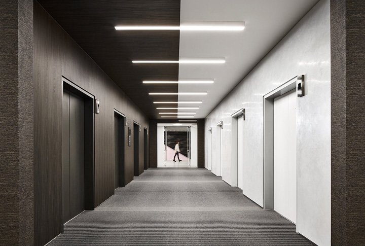 通过材质应用和对比的手法创建一个充满活力的个性化电梯厅;以酒店的标准来打造这里的公共卫生间。通过这些公共空间的塑造,以强大的设计推动力去创建符合这座建筑和业主美学的全新建筑标准。#办公室空间设计案例#