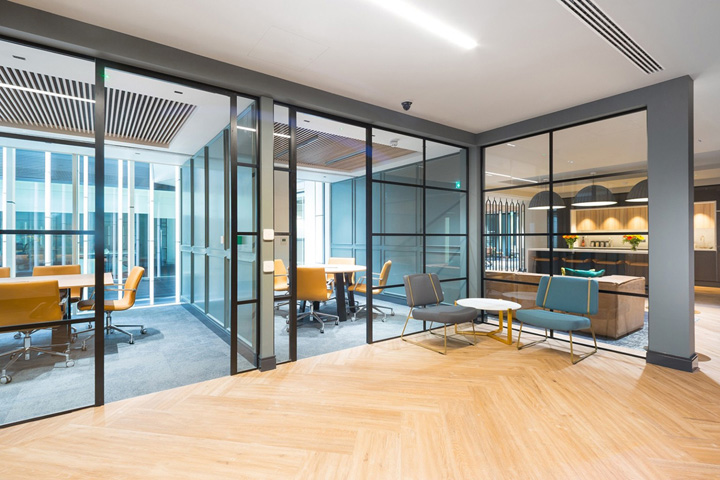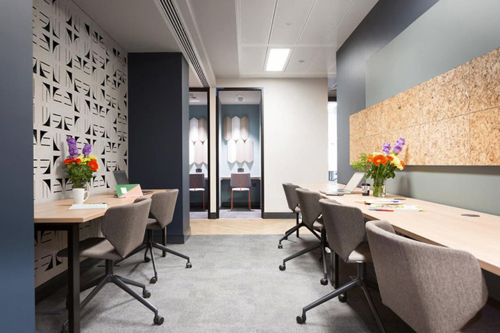 这处新空间设有一系列会议室、咖啡吧、沙发座,以及多样化的工作空间:从大型多人共享的工作台到小至一人的静谧电话间。接待区的特色吊顶以其独特的姿态迎接来访者,开敞的空间视野让访客在等候时静静欣赏室内空间。#办公室设计#