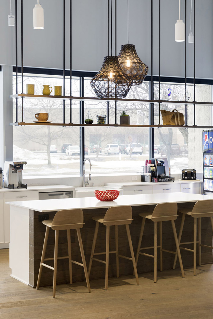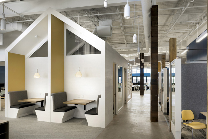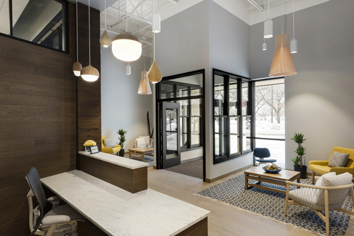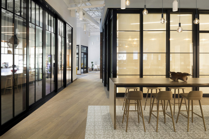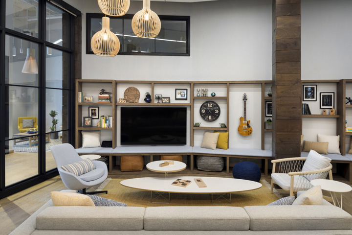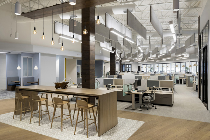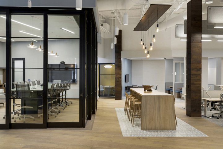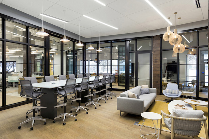 沉稳而低调的空间氛围,却拥有着世界前沿的科技配置。远程视频会议系统在这里随处可见;白噪声通过多用途扬声器(放音乐或通话系统)得到阻抗;恒温系统可通过电话app来调节;沿窗布置的光收集灯具有助于减少日出后所用的照明和能量;所有的窗帘都可通过轻松的开关控制降低强烈日照和热能。#办公室装修设计公司#