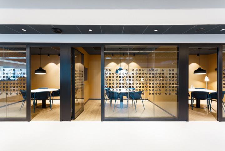 可持续发展理念在本案得到完美体现,采用的许多新材料都是回收再利用材质。比如由深蓝色纤维毛毡包覆的漂亮墙面和吸音挡板吊顶,它们都来自塑料饮料瓶的回收再生产。而且,未来还可以再被回收利用。#总部办公楼设计装修#