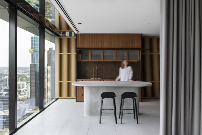 调色板由丰富的蓝色和橄榄绿色定义,以自然饰面和中性色调调和,如斑点胶木材的使用所见,它带来了与调色板其余部分相得益彰的温暖。自由成型的混凝土也被引入,通过弯曲的形状软化。窗帘以丰富的深蓝色脱颖而出,当您绕着曲线行驶时,会逐渐淡出柔和的颜色。#公司办公室装修设计#