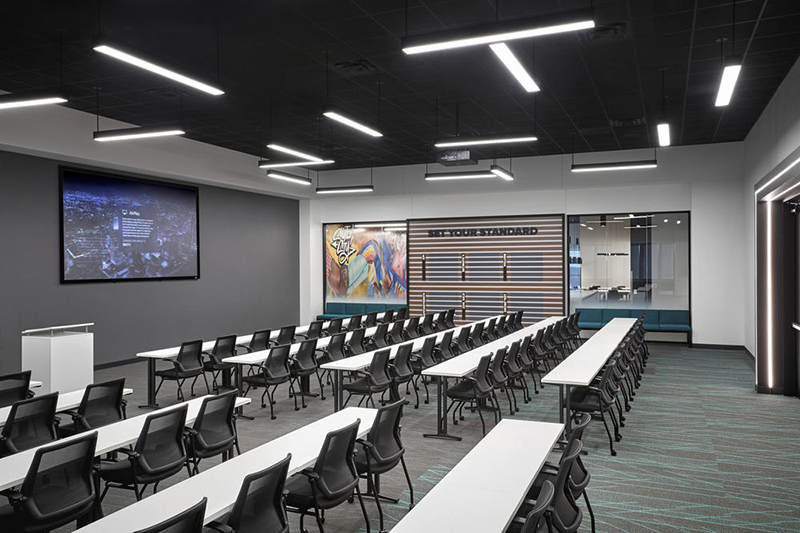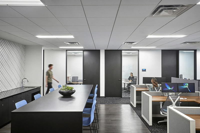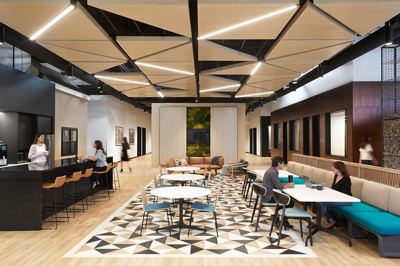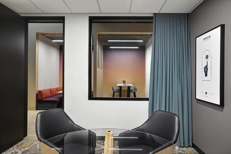 精美的细节、沉稳的配色和自然元素的应用,平衡了彩色涂鸦带来的视觉张力。本案的一个亮点包括使用音乐传感器作为员工进出会议室的趣味感官元素,为一天的工作带来好心情。为了加强这种用户体验,设计团队加入了将品牌元素与音乐节拍相同步的灯光互动设计。#办公室空间设计案例#
