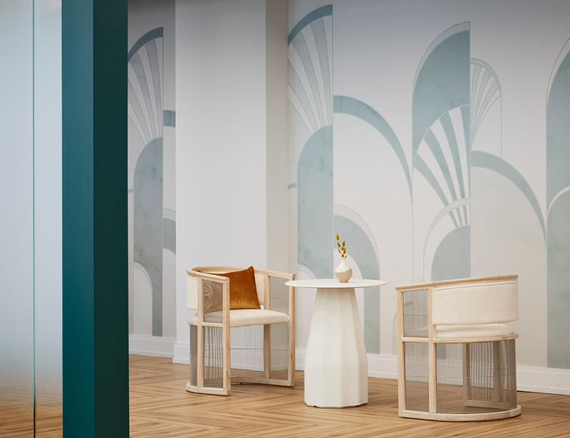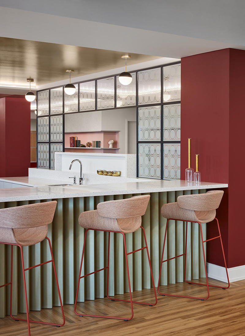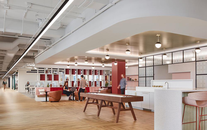 明亮又开敞的空间,带着些许的装饰艺术主义风格和奇妙的特色,并装饰以长长的铁轨式光之照明。柔润的曲线,配以粉色、浅绿色、勃艮第酒红色和蓝绿色的装点,让整个空间都浸润在复古、温润的氛围中。#办公室设计装修案例#