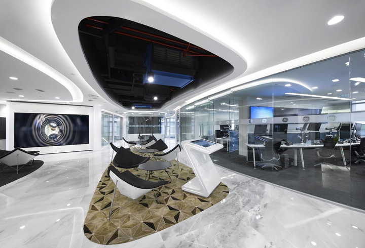 接待区流畅动感的弧形设计营造出颇具未来科技感的空间氛围。这里设有一面大型集成触摸屏显示墙,在等候区有一个互动触摸屏,让来访的客户在等候过程中了解GE未来发展前景。#广州办公室装修公司#