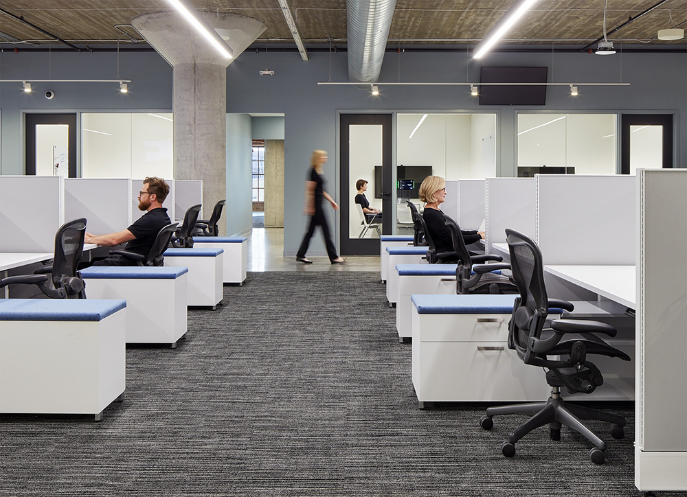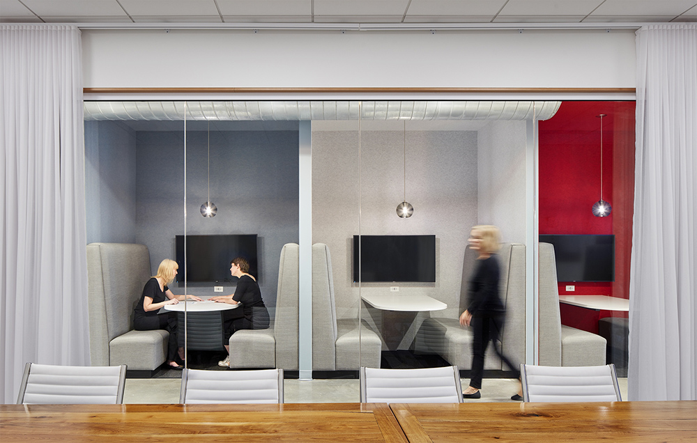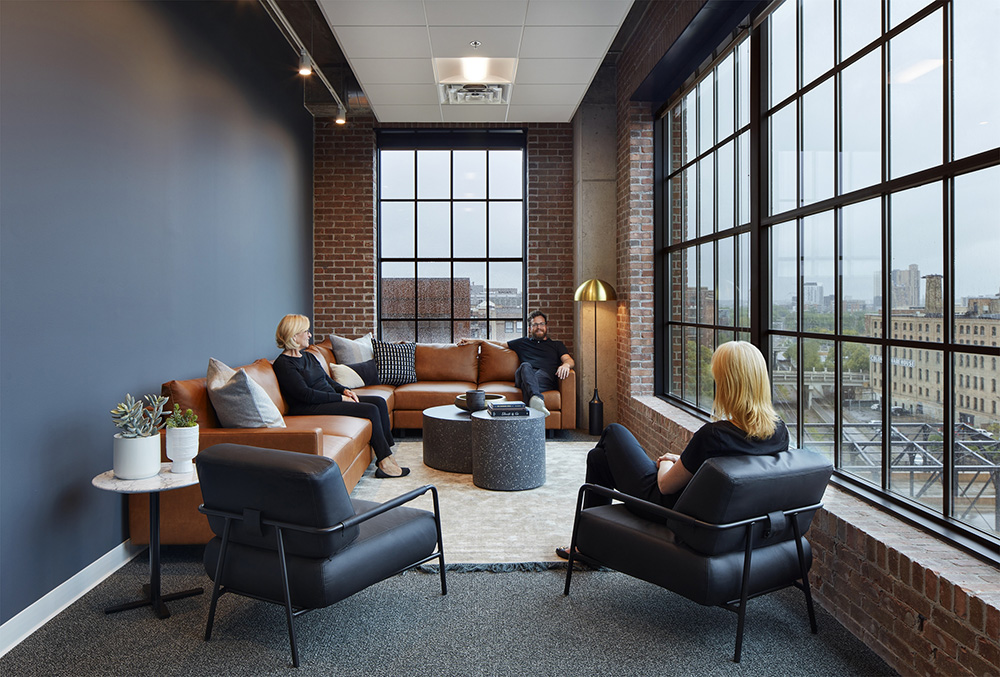 会议区域和工作区域由毛毡包覆的会议区巧妙地分隔开来。这样的设计有助于工作区域的私密性和专注性。极简的配色和设计语言,通过精心的空间布局,塑造出一个激发灵感和无限创想的自由之境,赋予办公空间更深层次的精神内涵。#办公设计案例#