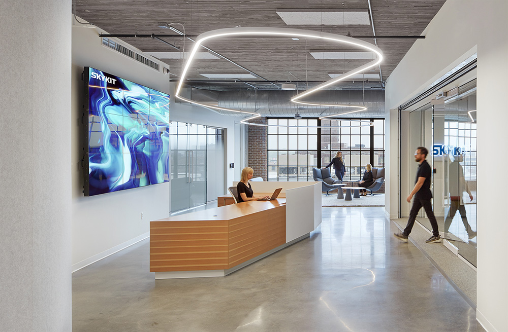 办公室空间装修:设计以灯光来启发和引导客户和访客的空间体验,借此传达建筑细节和品牌文化。入口区强化了品牌的主色彩,营造出强烈的视觉冲击,同时又融合于白色的环境背景中