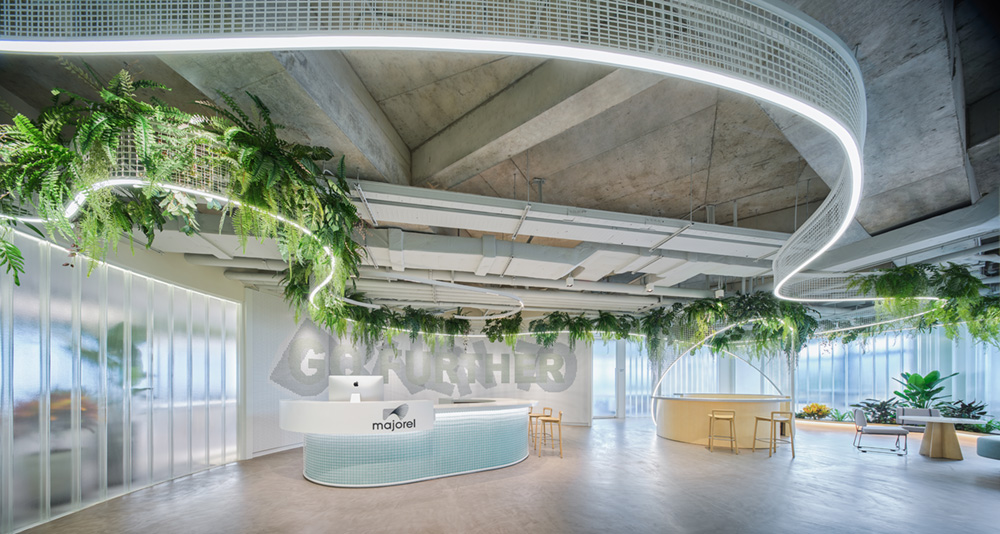 办公楼设计装修:此次项目设计的主题命名为“城市丛林”,希望引景入室,以自然为媒介,探索后工业时代的空间表达形式,修复在当下的建筑语境里面,人与自然的关联
