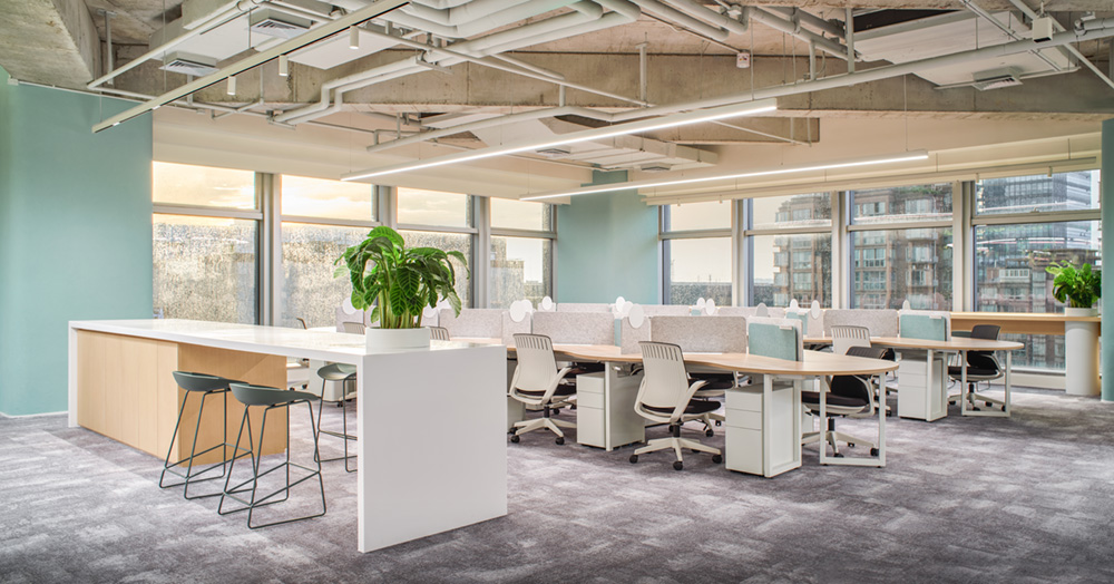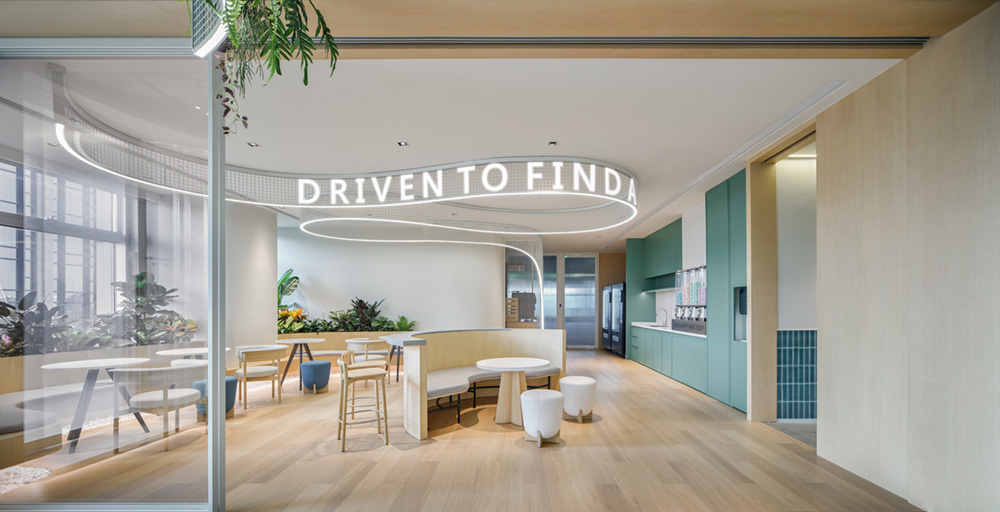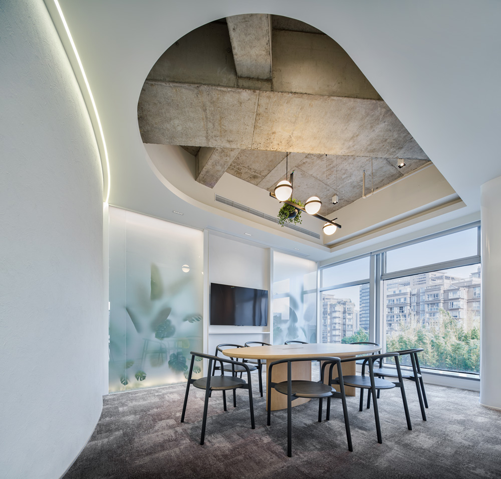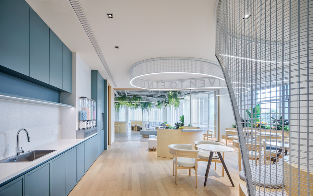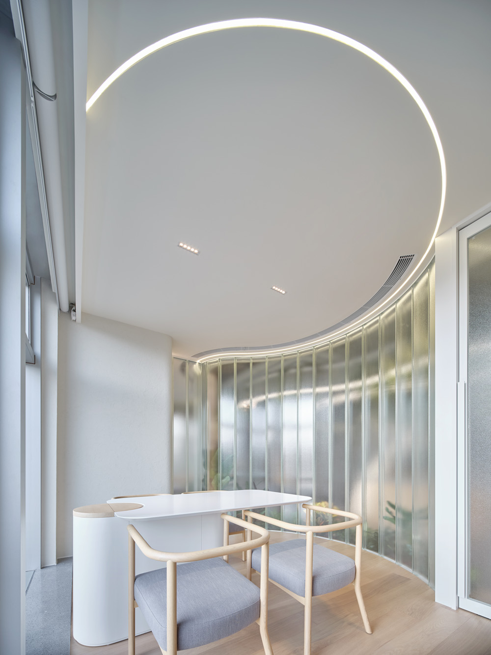在空间功能分区与动线规划上以建筑结构柱轴网作为部门分区,每组工作站在柱子边设小组讨论吧台,半开放圆形造型经理位穿插于工作区,作为分区枢纽、便于高效沟通。功能分区不是恒久不变的,随办公空间的需求而变化,展现了空间的开放、包容、充满创造力和高效能的特质。活动家具,可以随喜好或使用场景来变换形态,给人一种趣味感。以共享办公社区的概念模糊私人空间、独立空间的边界,让企业员工参与进来,他们是空间的主人。#室内设计案例#