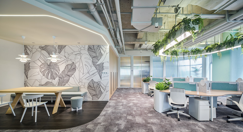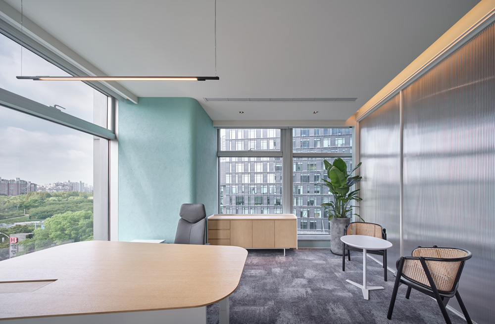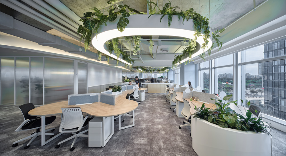 天花垂吊绿植、会议室以植物作为隔墙造型、地面选用特定造型感花槽、经理位定制圆形隔档以绿植为屏风分割……多层次立体的“丛林”形态,消解空间的存在,与户外的公园相呼应,打造出有机的生命体空间。室内设计秉持自然、亲切、真诚和温暖的原则,柔软的触感可以降低工作压力;大面积使用白橡木木饰面,灰色羊毛毛毡隔档,增加舒适感;灰绿色肌理漆、混凝土以自然的色调传递空间氛围;定制的U形绿植吊灯延续空间的流动性。#办公楼设计装修#