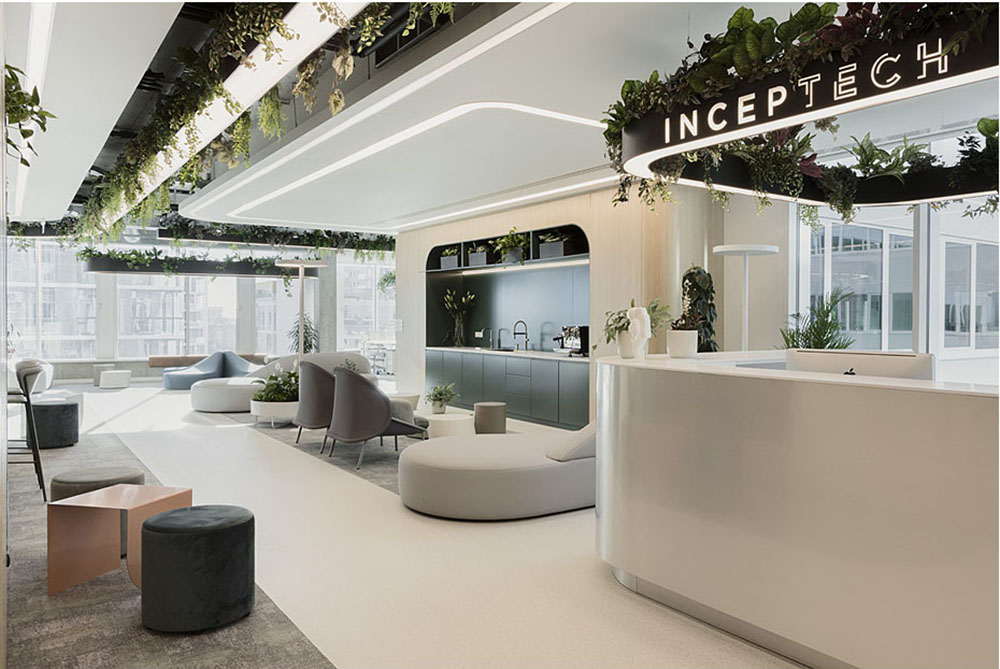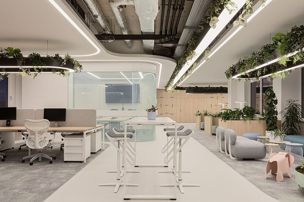 设计团队创建了清晰和简洁的品质空间。其主要理念是创造一个开敞明亮的办公空间,在这里,技术系统偶尔会像在宇宙飞船里一样展示出来;同时绿植也在空间中发挥着重要作用,集成于灯具中、家具中或构成一面鲜活的绿植墙,与轻盈明亮的配色形成对比,营造出童话仙境般的唯美意境。#办公楼空间设计#