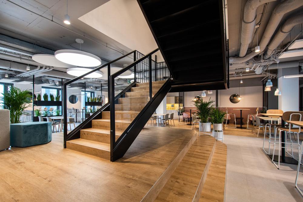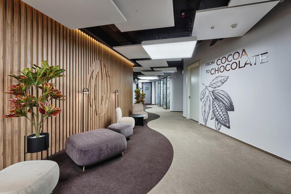 咖啡吧的设计与接待区的吧台桌异曲同工,以简约工业风的设计搭配软装烘托场景氛围。以可可豆为主题的壁纸设计创建了趣味化的艺术视觉体验。这里的吧椅和天花延续了接待区的设计语言。大会议室依旧是美味巧克力色的精致搭配,将浓情巧克力的质感融入到每个空间场景之中。走道上的壁橱也覆盖着满满的可可豆插画壁纸,与地面深深的巧克力色相呼应,将氛围渲染到极致。#凯悦装饰-办公装修#