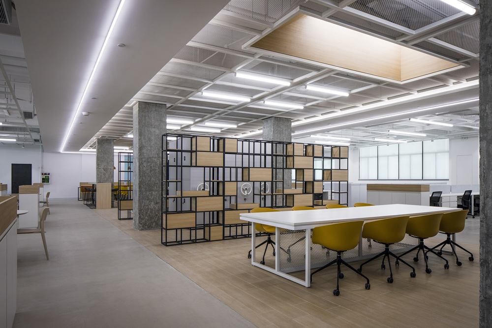 空间内的选材素简,包括温暖的木、冷静的水泥石膏板和金属,在开放的工作环境中创造亲密和舒适的体验。设计师试图创建一个安全友好的工作环境,从而增强团队的合作精神、彰显品牌的价值和美感。大堂采用网格矩阵式的天花板,柔和的光线漫射而下,营造出宁静而优雅的氛围。#办公室装修设计#
