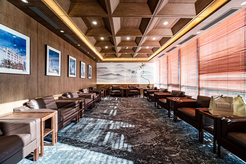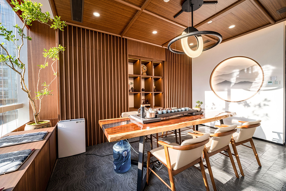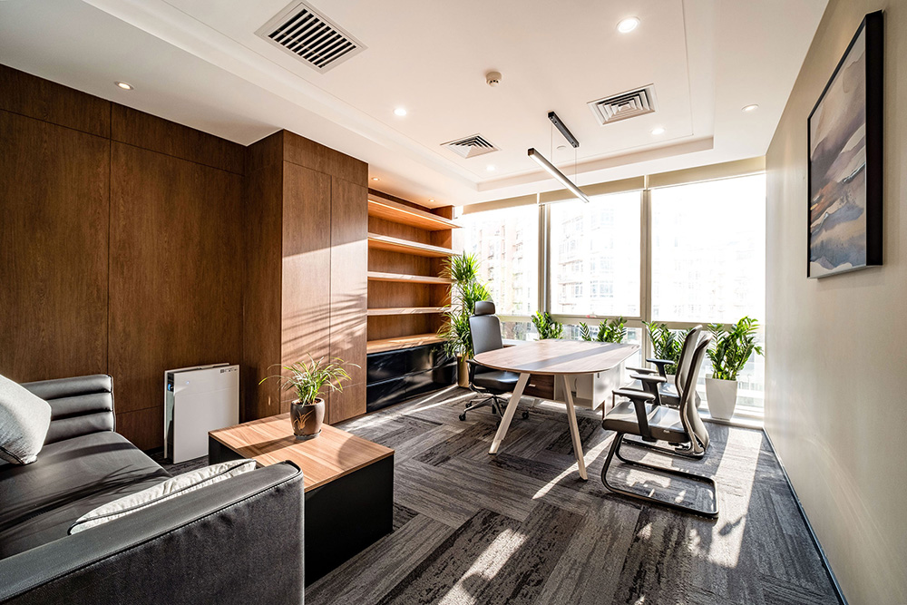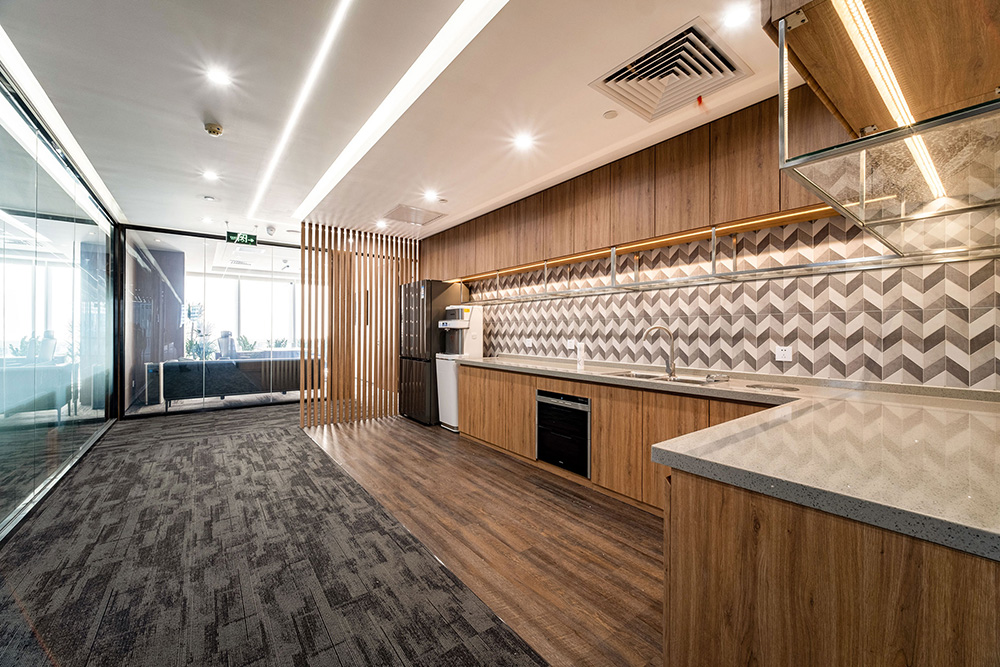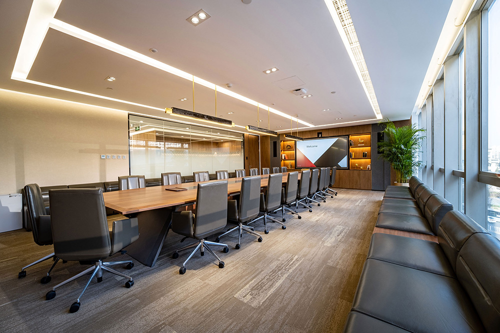 在材料方面充分考虑了经济性和环保性,首先大量的木饰面材料用更为环保和安全的贴膜材料进行代替,采用挂板的形式提前确定木挂板的尺寸模数进行外加工,从而减少多余尺寸的浪费及装修完毕之后的空气污染。其次考虑了灯光照明的组合性和节能性,所有会议室采用配比人体感应智能??榭刂疲迪秩私远?,人走自动熄灯。#办公室设计#