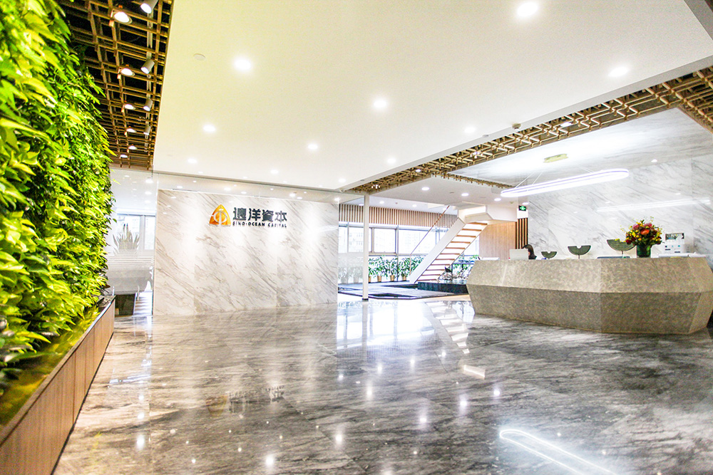 办公室设计:楼梯周围结合楼梯做了水景和园林绿植景观,增加空间的观赏性