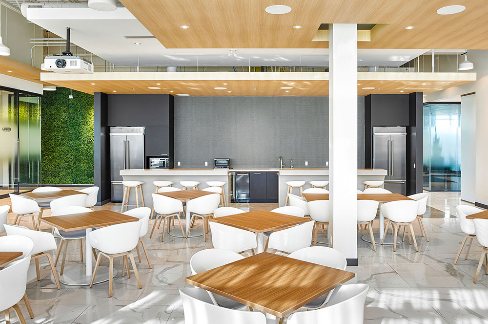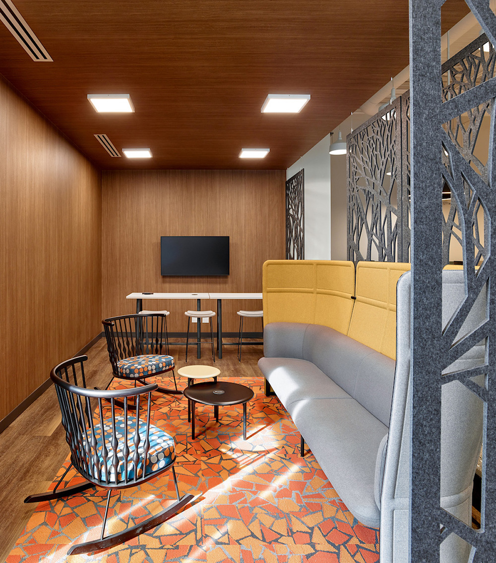 通过在中心地带规划需要墙体的空间,整个平面被自然划分成四个社群区域。每个社区都设有一个具有独特视觉特征的中央公共休息“广场”,并且分别以不同的四季特征赋予其不一样的氛围情境。比如,“夏季”位于两个小木屋之间的一个平台上,犹如室外露台一般。秋季、冬季和春季则下沉嵌于架空地板内,形成独立的空间。秋季休息室配以Haworth沙发和Andreu World摇椅,以及面向电视的咖啡吧。冬季则是以曲线结构来呈现冰屋的形式。春季则是可容纳两人的咖吧桌、两张休闲椅和一个秋千椅。#大楼设计装修#